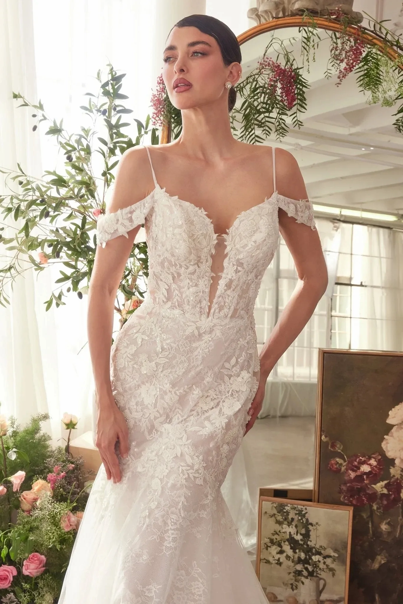 This stunning mermaid wedding gown features a plunging V-neckline with delicate off-the-shoulder lace straps and a sheer bodice adorned with lace appliqué. The fit-and-flare silhouette beautifully highlights your curves, flowing into a layered tulle skirt for a dramatic effect. Perfect for brides seeking a romantic and elegant look, this dress is ideal for a timeless wedding day. Key Features: Silhouette: Mermaid Design: Plunging V-neckline, off the shoulder lace straps & sheer bodice Fabric Material: Layered tulle & lace applique Fit Detail: Fit & Flare Occasions: Wedding gown, Bridal dress