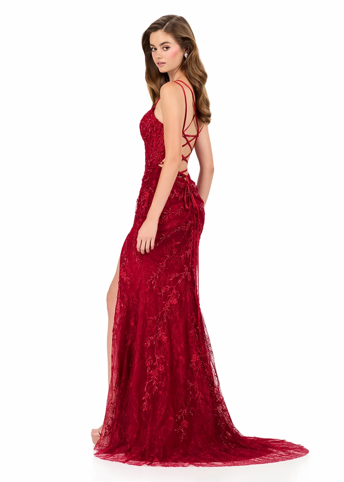 Steal the spotlight in ASHLEYlauren Style 12189. This sleek lace applique gown features a structured corset bodice with illusion details and a lace-up back. The fitted skirt with high slit and sweep train delivers an ultra-feminine and sophisticated look.