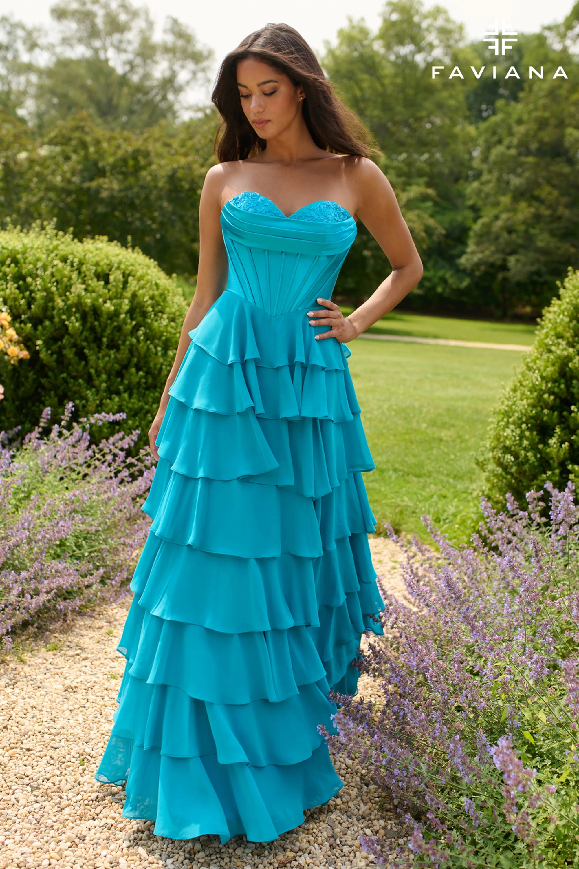 Peekaboo Corset Satin And Chiffon Dress With Tiered Ruffled Skirt