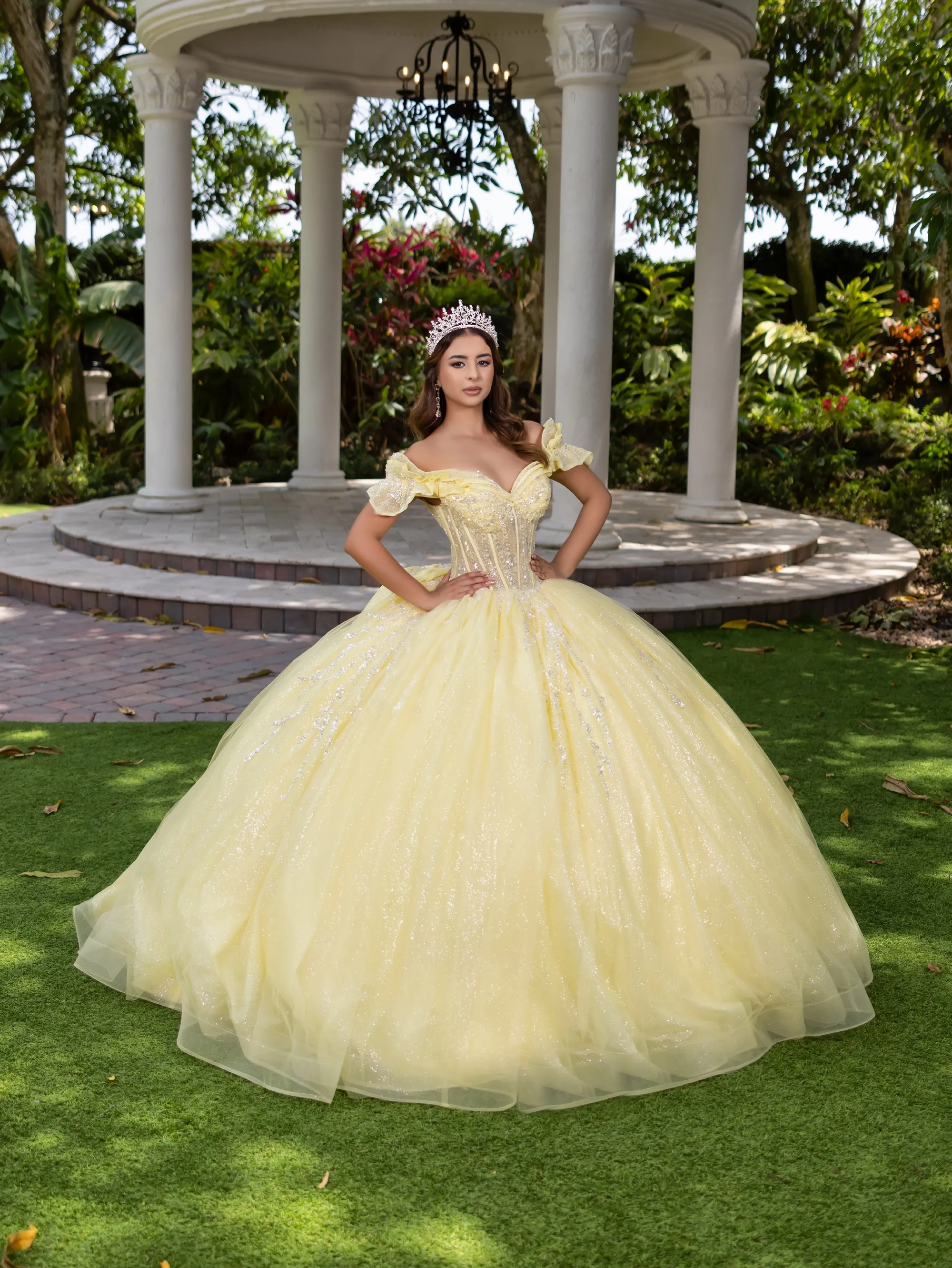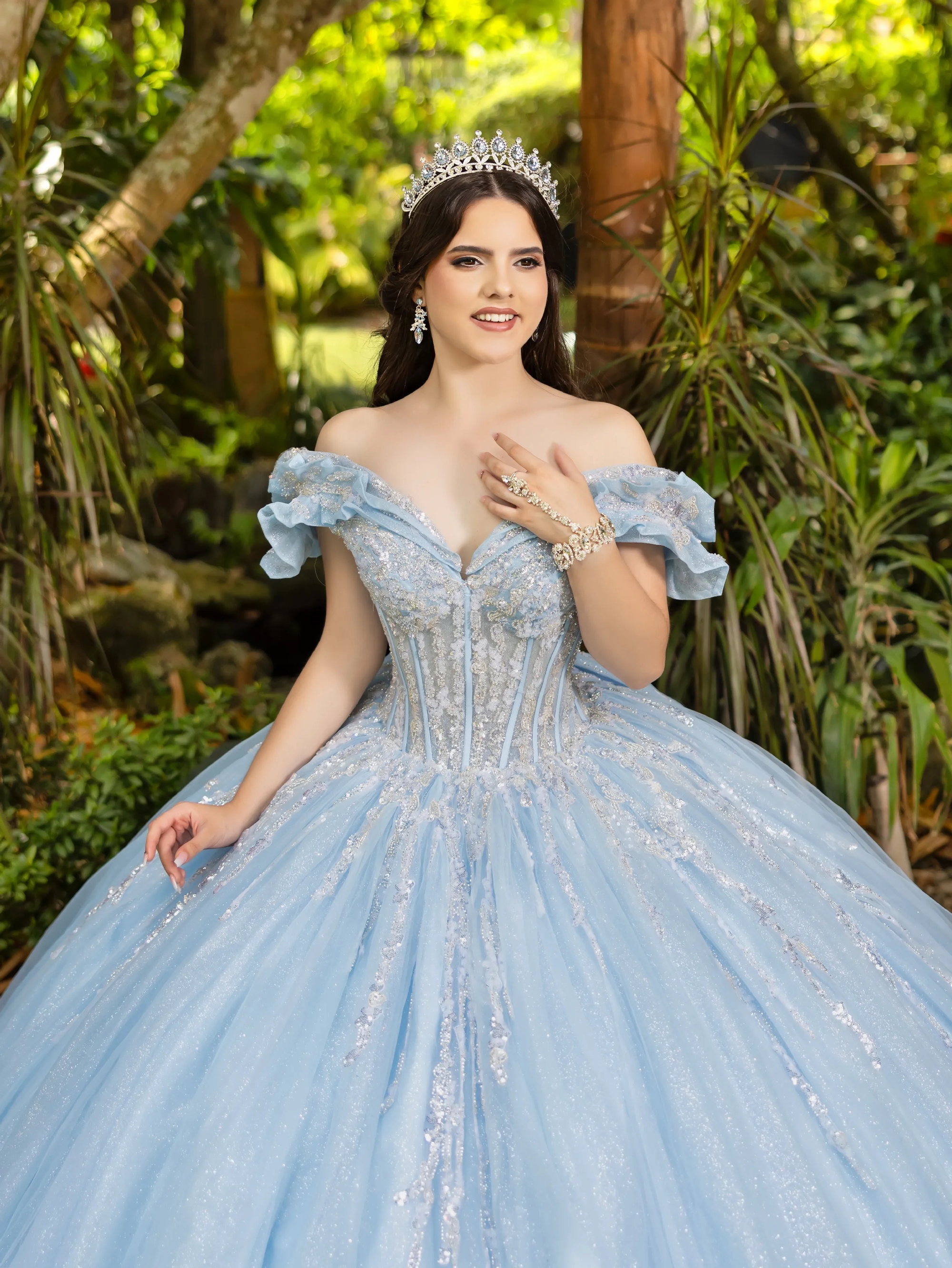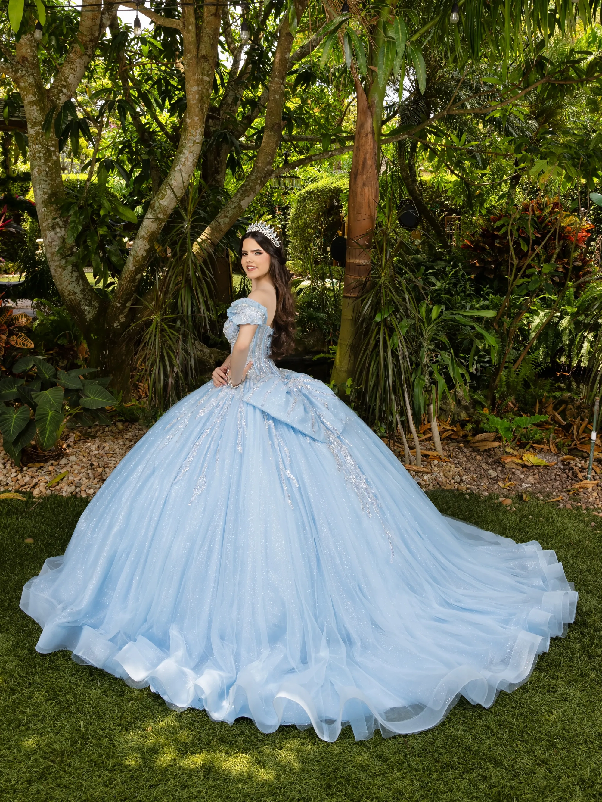 This stunning Quinceanera fantasy gown is beautifully adorned with metallic floral lace appliqué. The gown showcases a dazzling burst of metallic glitter that embellishes the off-the-shoulder neckline, waistline, bow, and back train. Horsehair is added to the bottom of the train to ensure a polished look.