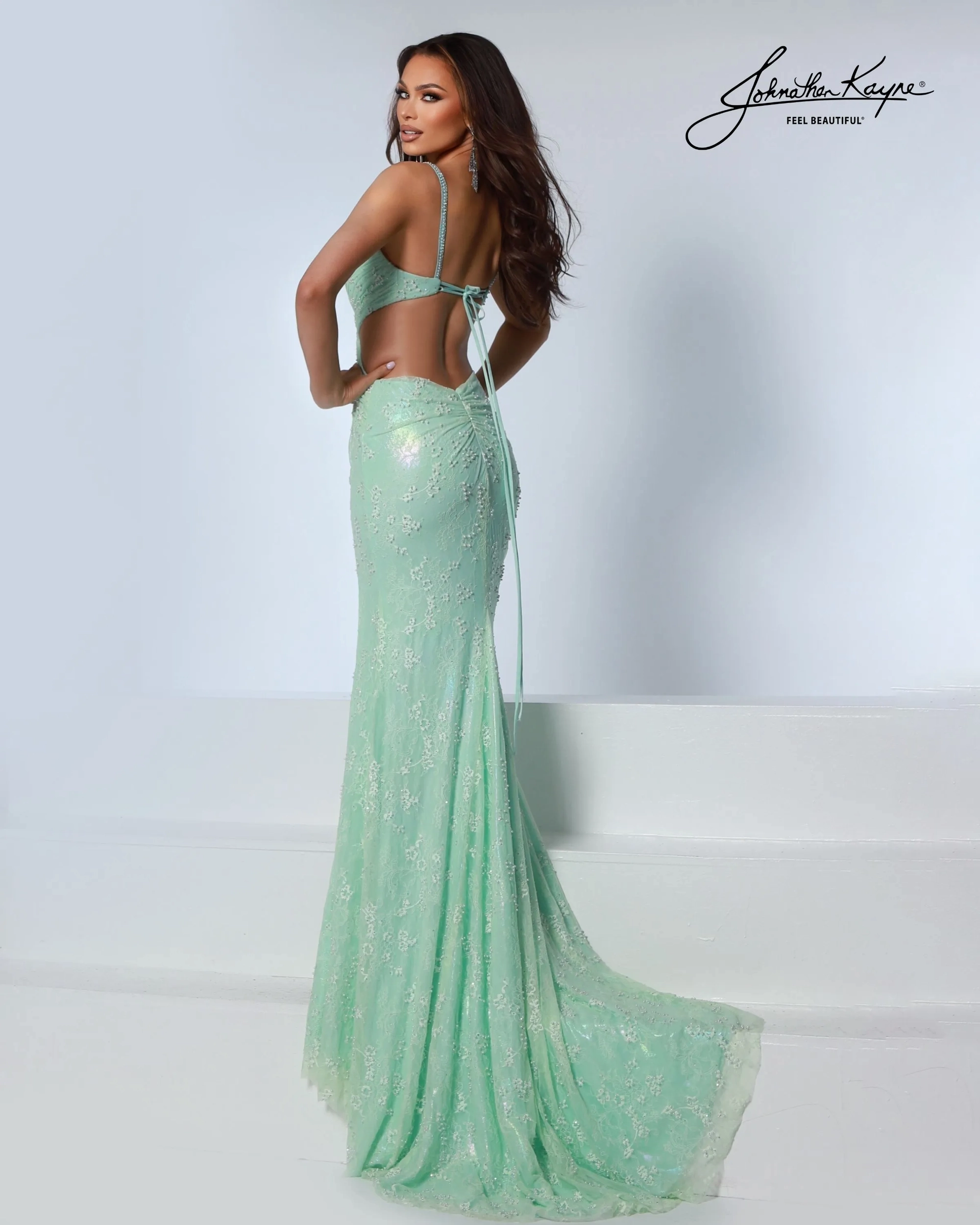 Flirty and effortlessly chic - this stretch lace gown is adorned with shimmering pearls, metallic lining, and features a figure-hugging silhouette with daring cut outs and an open, lace-up back. The thigh high slit adds the perfect touch of confidence for prom.
