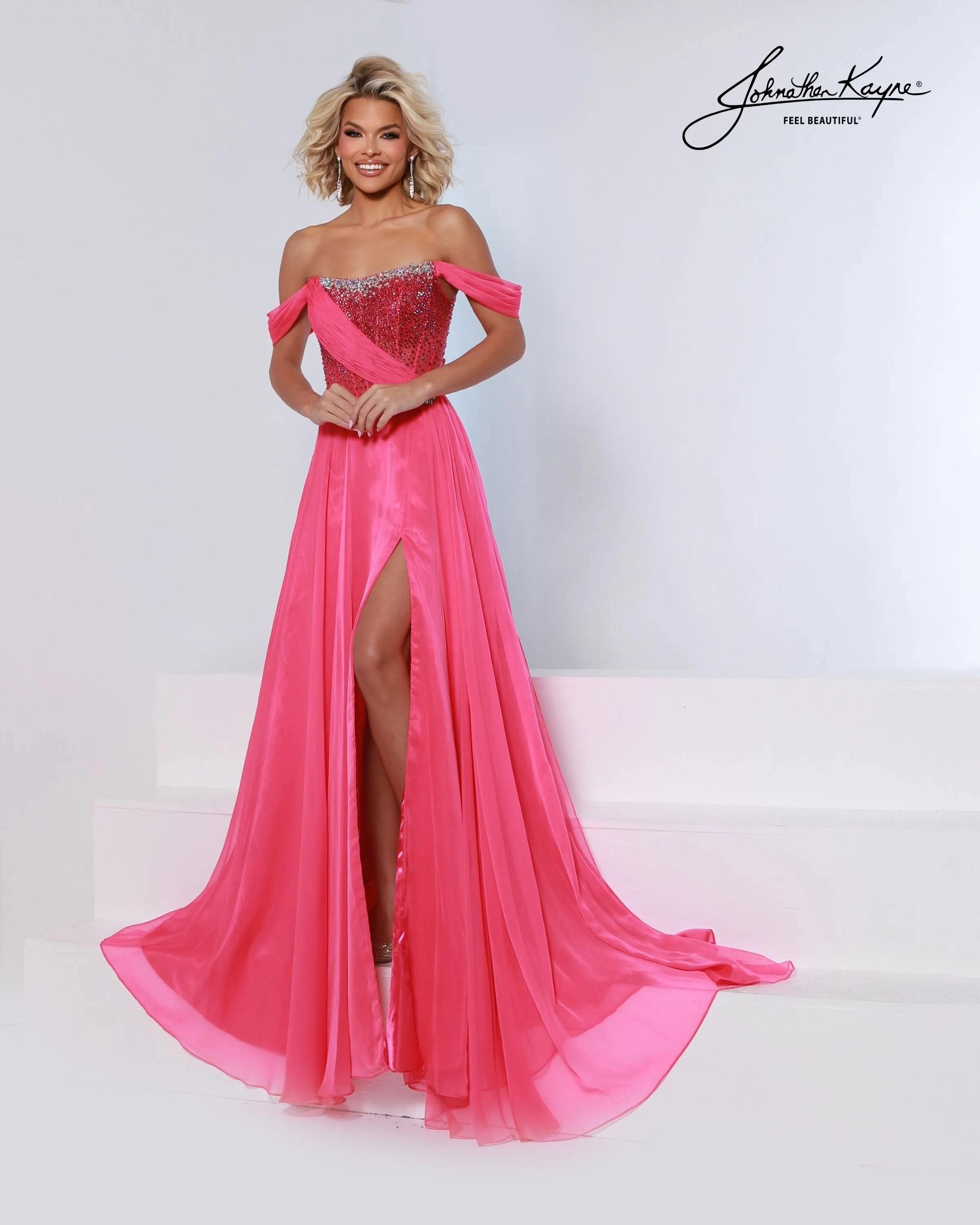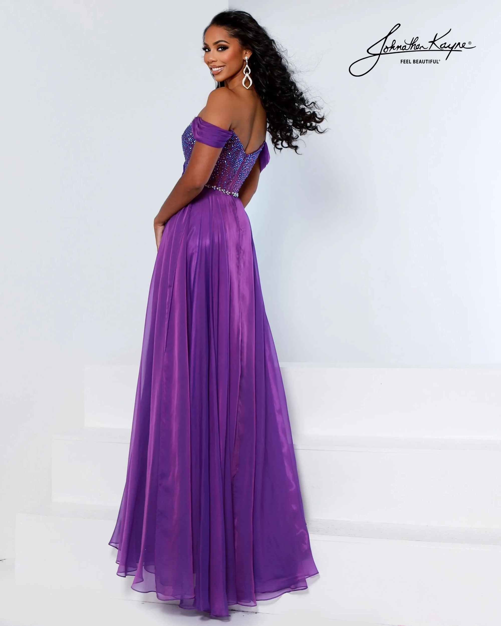 Own your stage moment in this off-the-shoulder iridescent chiffon gown featuring a beaded bodice, exposed corset, and softly draped overlay. The cinched waist and flowing A-line skirt move effortlessly with every step, while the thigh-high slit adds the perfect touch of confidence and allure.