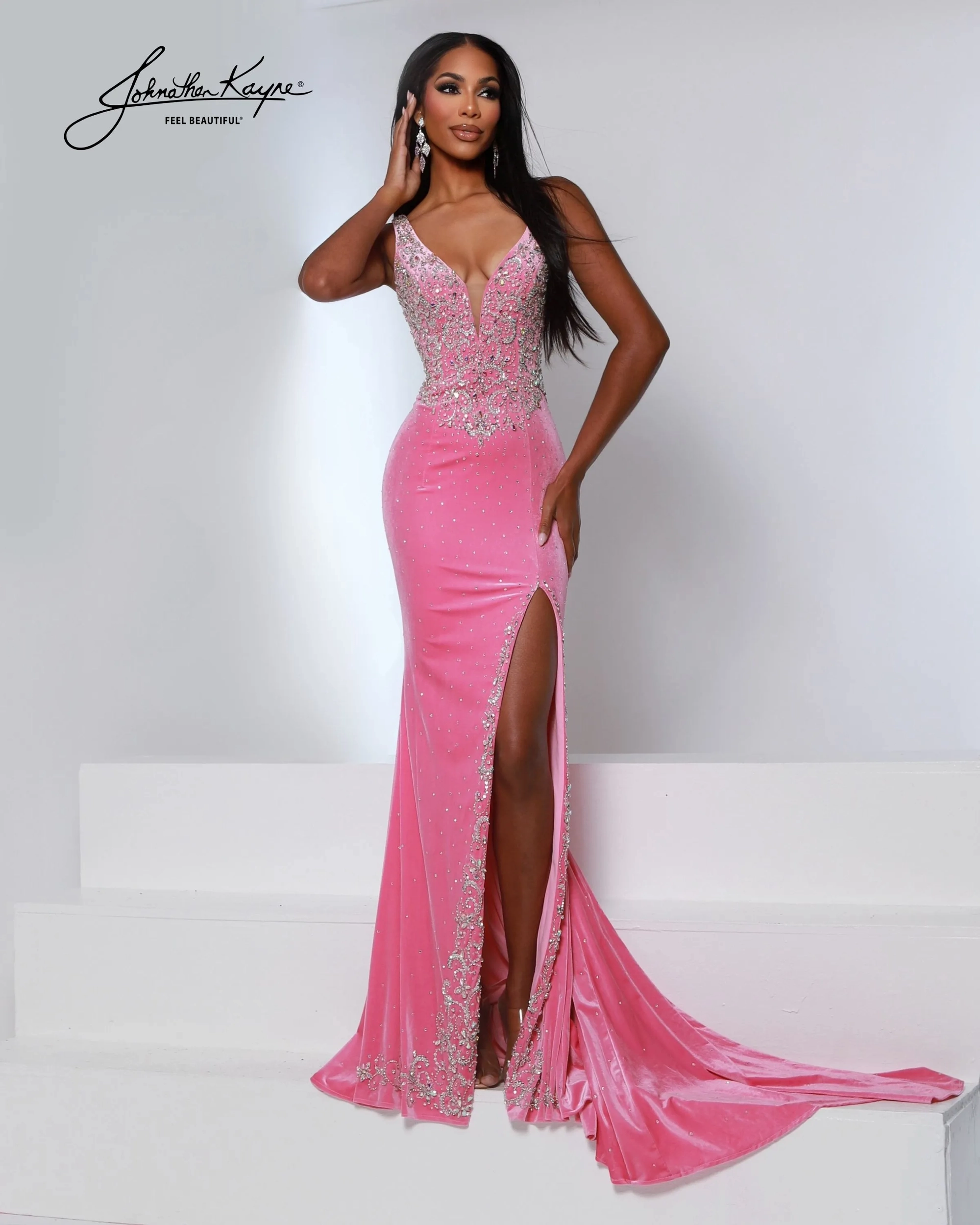 Exude timeless glamour in this beaded stretch velvet gown featuring an illusion plunge neckline and a flattering slit. The crystal detailing and dramatic train create a regal look for evening gown, red carpet, or formal occasions.