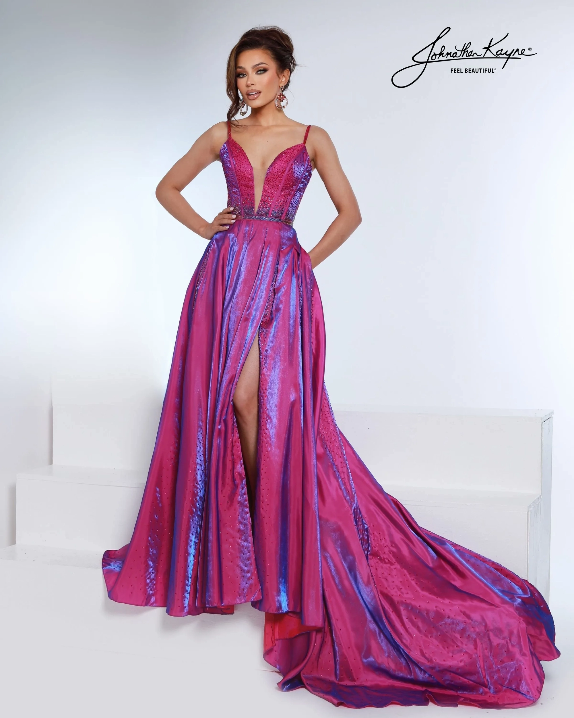 Own the stage in this stunning iridescent satin gown made to impress. Crystal embellishments trace the plunging neckline and box pleated skirt while the dramatic A-line skirt and slit ensure a striking silhouette from all angles. Elegant yet daring, this gown was designed for queens who love a little sparkle and a lot of confidence on any stage and at prom.