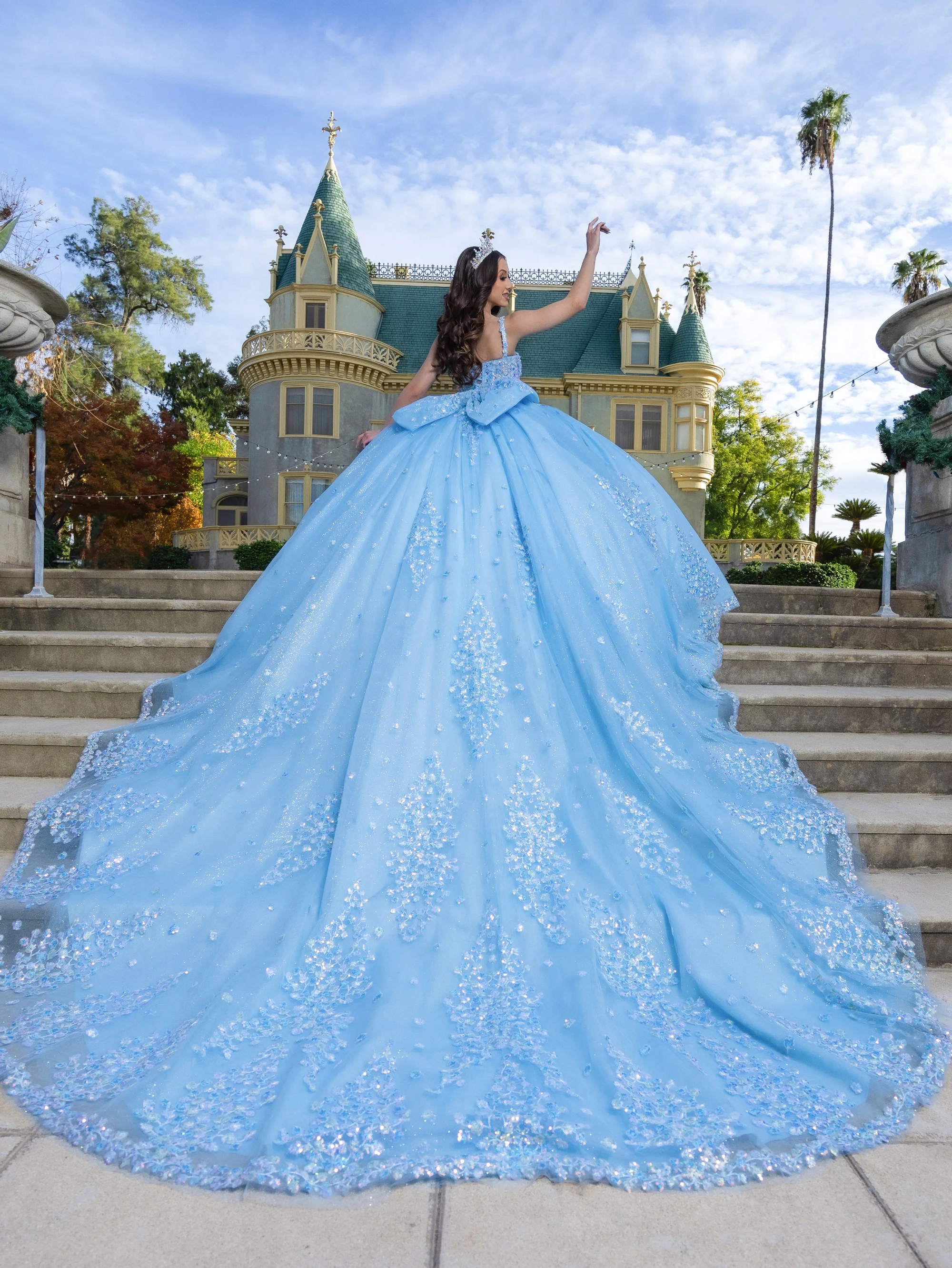 This princess Quince ball gown is the perfect choice for your special day. The classic sweetheart neckline and bodice are fully covered in sparkle lace applique. The straps add a classic touch. Long sheer bishop sleeves add a modern touch. The full ball gown skirt is adorned with matching lace applique all around the skirt.