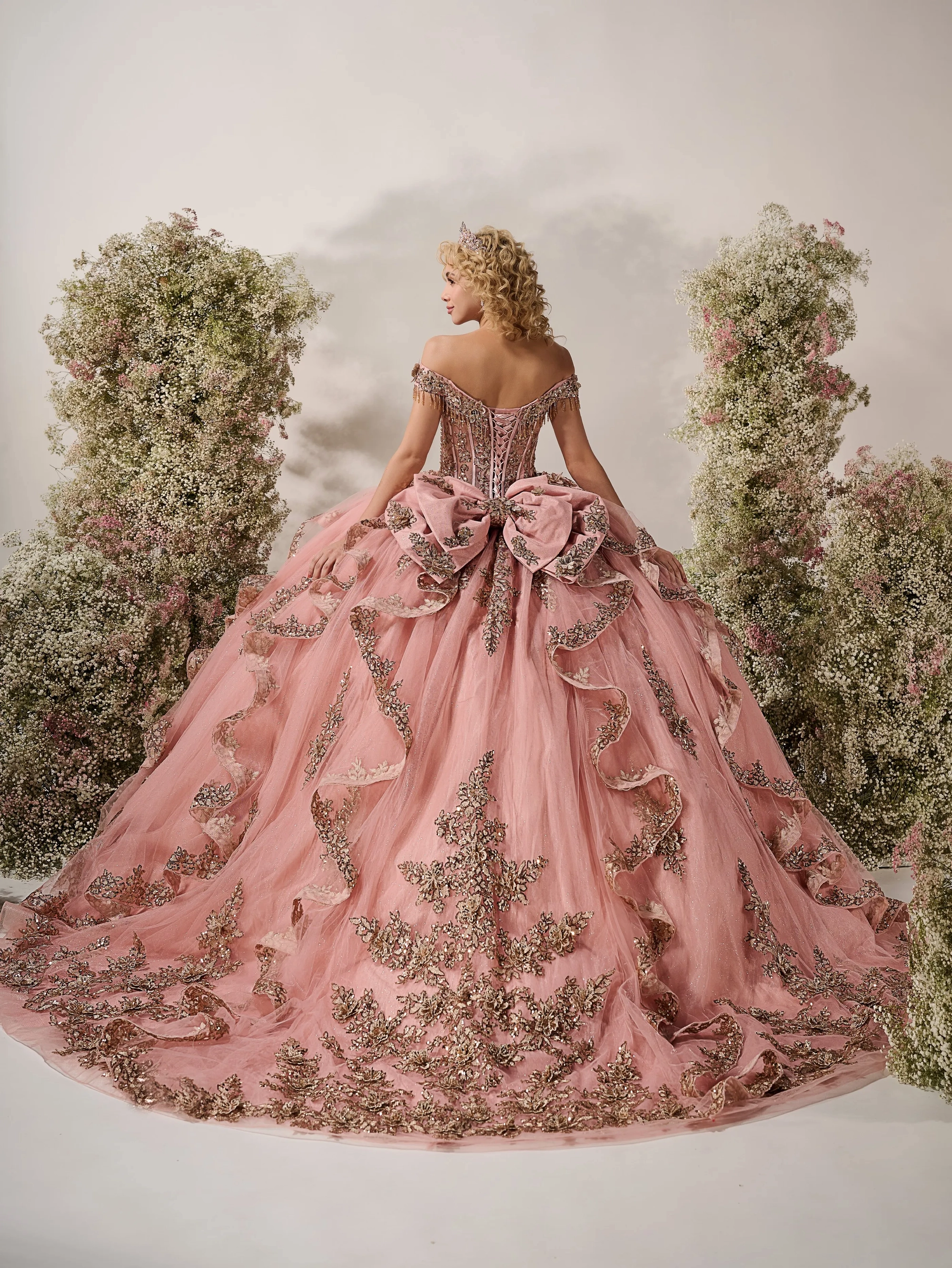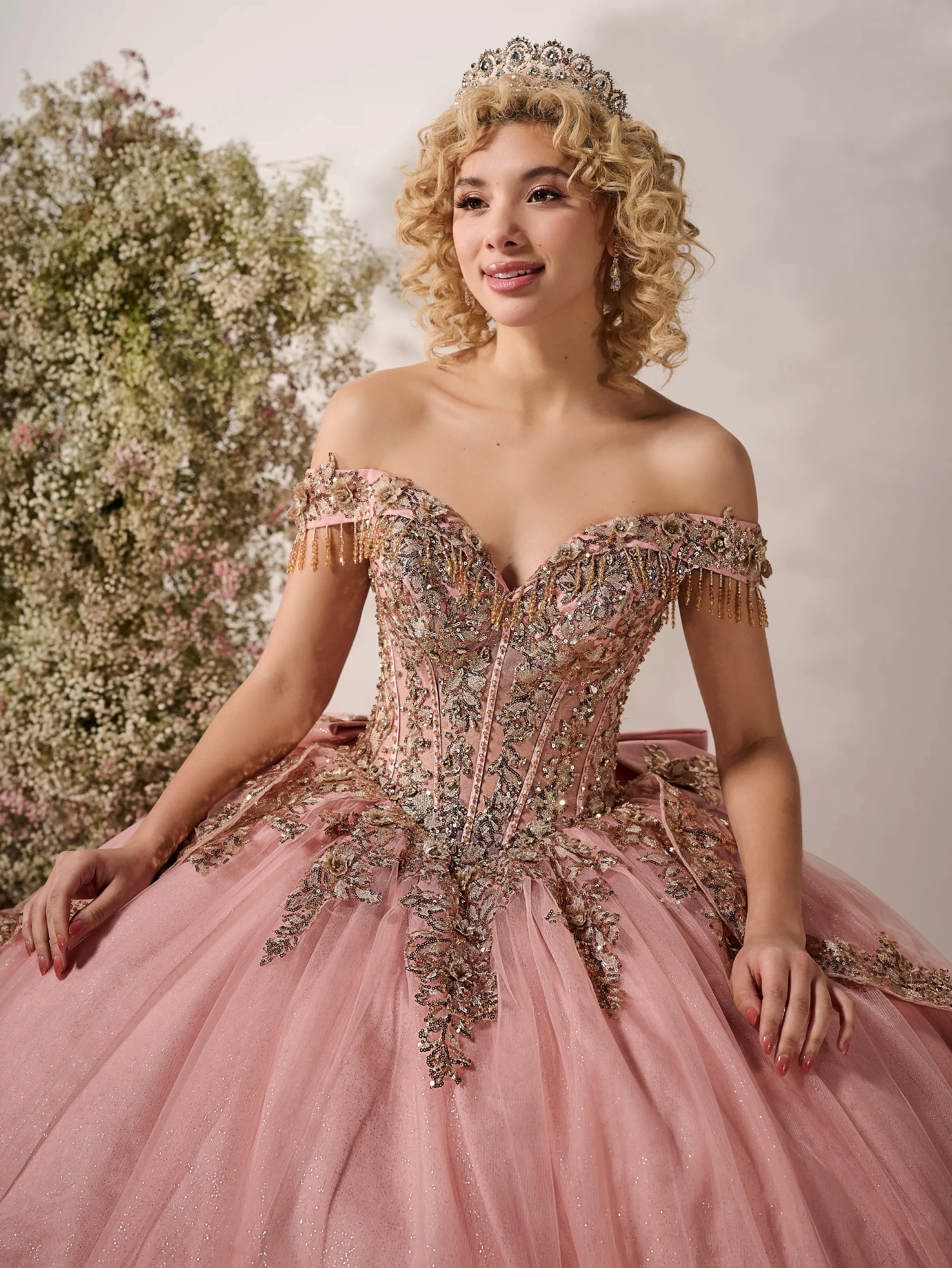 Dripping in opulence, the corseted bodice shimmers with intricate beading and delicate fringe that cascades off the shoulders. The voluminous skirt, adorned with dazzling embroidered appliqués, flows into cascading vertical ruffles at the back, creating a breathtaking regal effect. Tulle/Sparkle Tulle