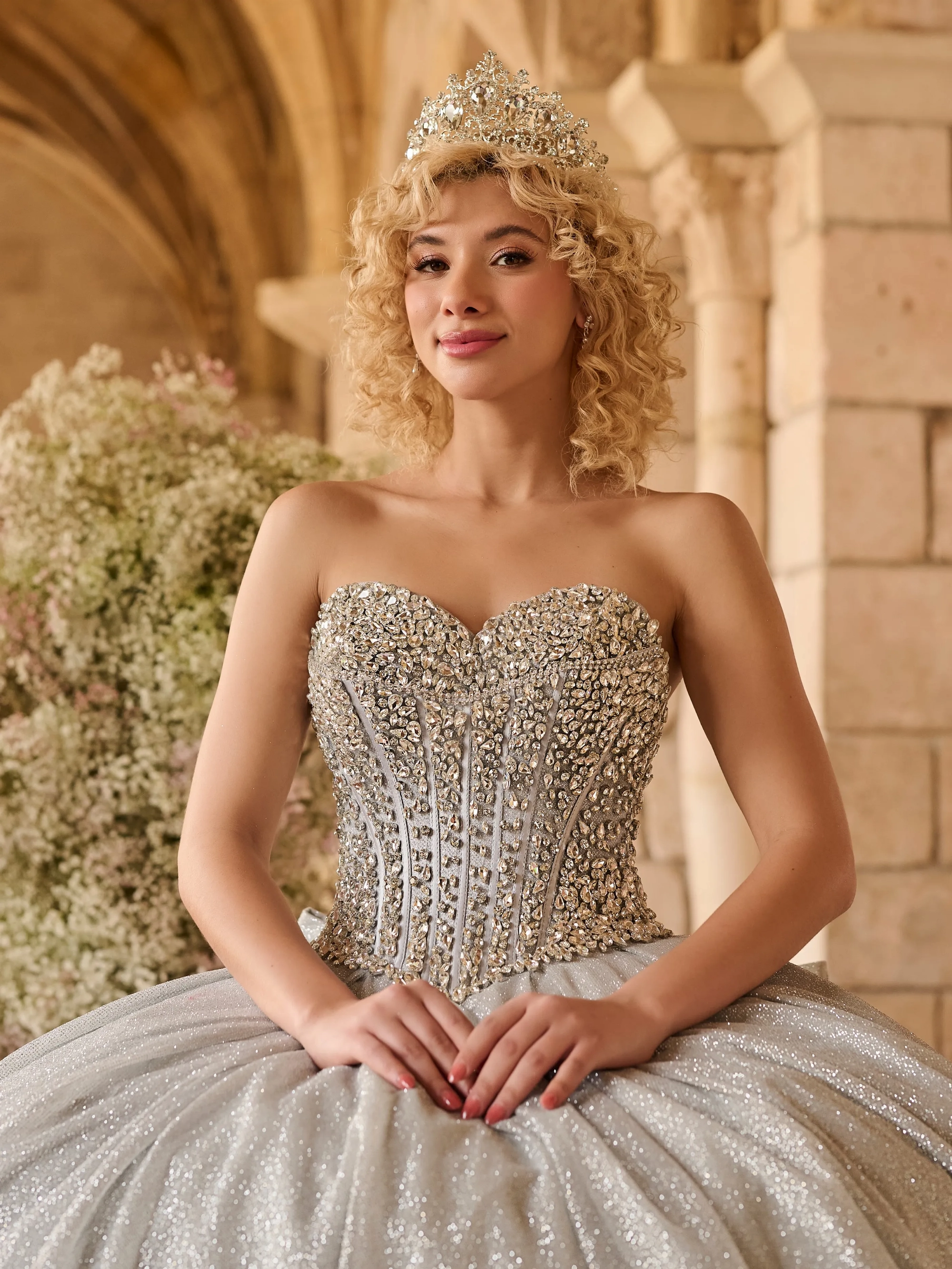 A luxuriously adorned bodice sparkles with crystal embellishments, perfectly complementing the shimmering glitter mesh skirt. A statement back bow with dramatic flowing tails adds an extra touch of grandeur, making this gown a true showstopper. Glitter Mesh/Tulle
