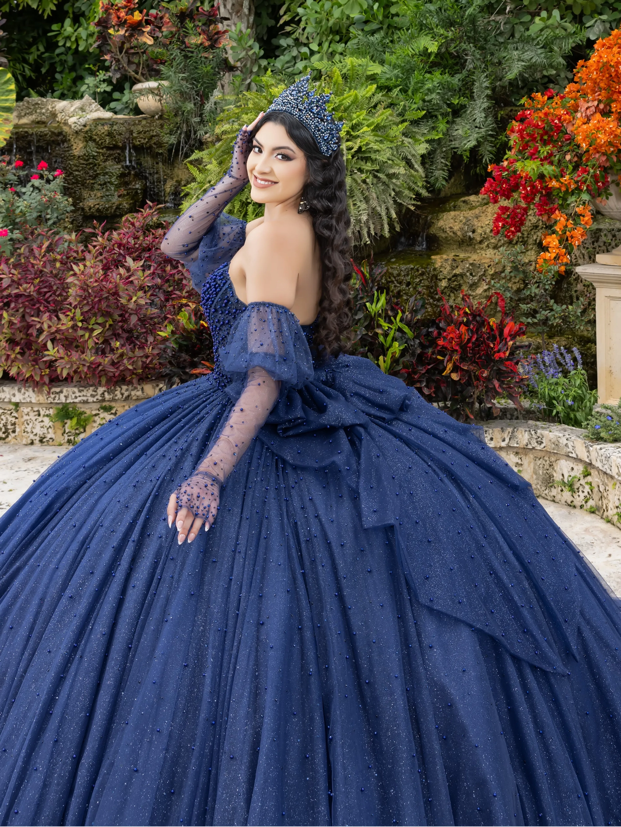 This princess Quinceanera ball gown is a perfect choice for a pearl-sparkling moment. The classic sweetheart neckline and bodice are embellished in color-matching pearls and sparkle. The ball gown tulle skirt carries on a stunning cascade of sparkle and pearls. We styled this look with matching gloves featuring puff sleeves and a shoulder wrap, giving you unique styling options. A back bow is added to complete this look. Pearls/Sparkle Tulle