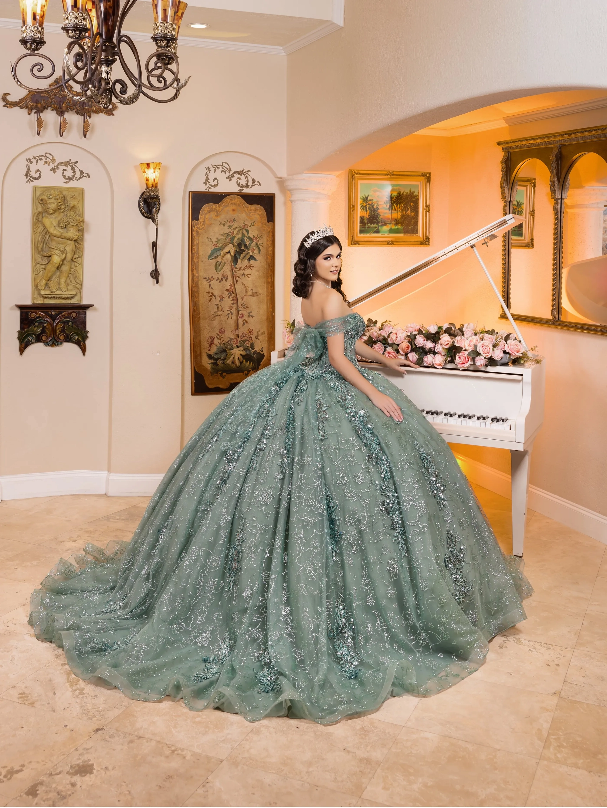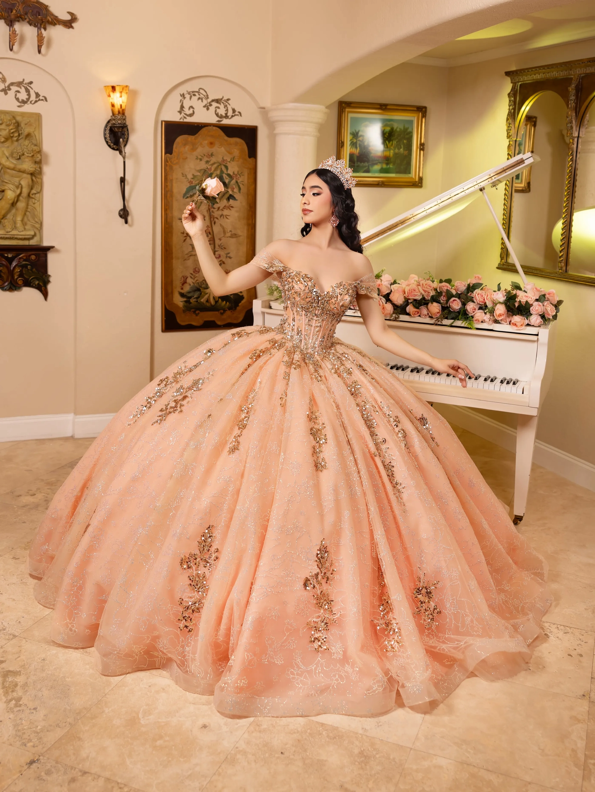 This stunning Quinceanera ball gown combines classic and modern styles. The dress features a timeless sweetheart neckline and a corseted bodice embellished with delicate lace appliqué and crystal beading. Off-the-shoulder detachable sleeves are included. The full ball gown skirt features sparkling tulle and hand-placed lace appliqué. The back train displays a 4-tier ruffle with an additional sheer layer. Sequins Lace/Floral GlitterTulle