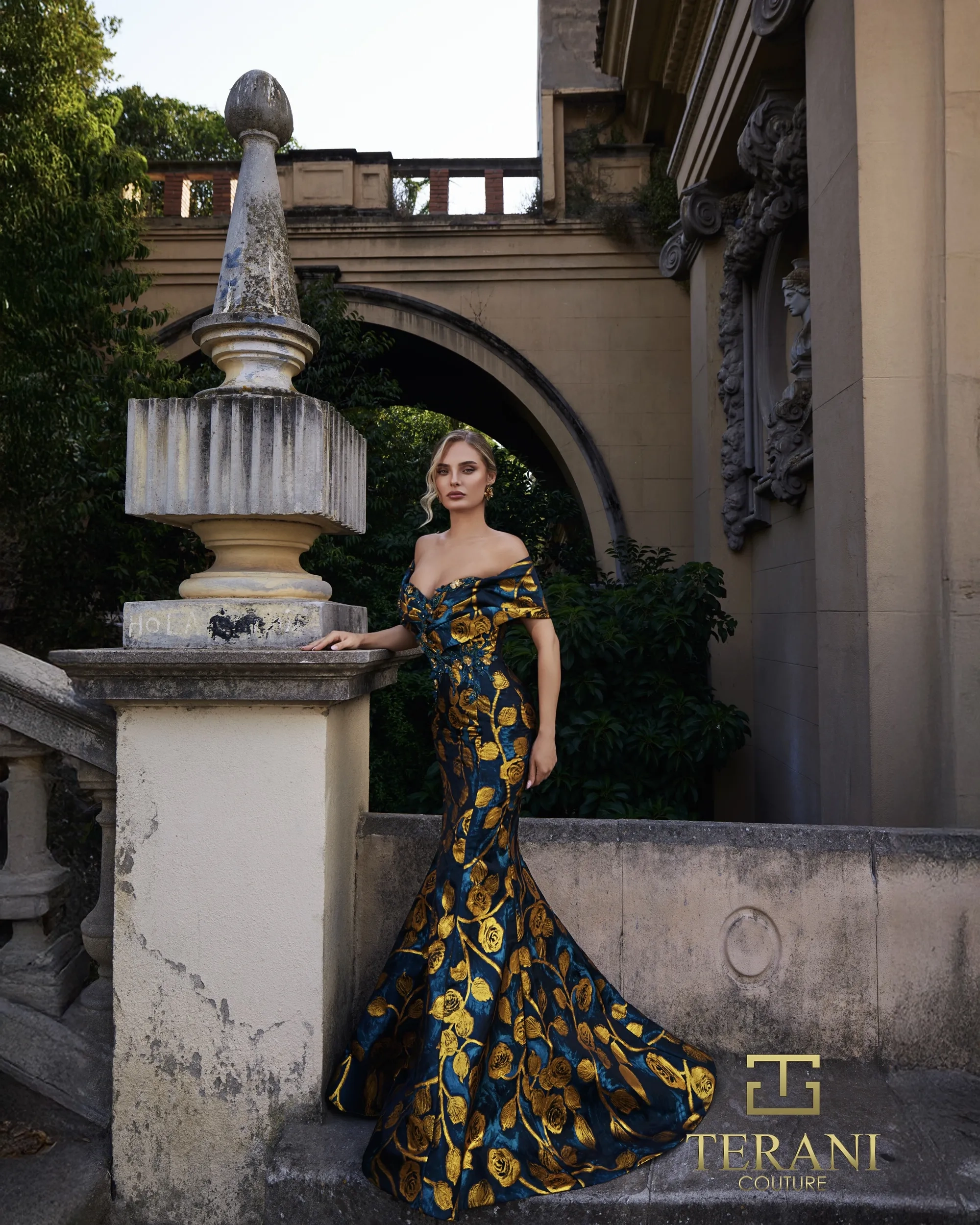 Step into pure sophistication with the Terani Couture 261E6273 evening gown, a captivating design that blends artistry with elegance. This off-the-shoulder mermaid silhouette sculpts the figure with precision, flaring into a dramatic sweep that enhances your every movement. Crafted from rich jacquard in an opulent teal and gold palette, the gown radiates luxury and modern refinement. The off-the-shoulder neckline highlights the décolletage, while the fitted bodice and flared hemline create a flawless balance of femininity and strength. A discreet center back zipper with hook-and-eye closure ensures a sleek finish from every angle. Measuring 46 inches from waist to hem, this gown is tailored for evening galas, black-tie affairs, or red-carpet moments. Perfect for the woman who wants to leave a lasting impression, this masterpiece is both timeless and fashion-forward.