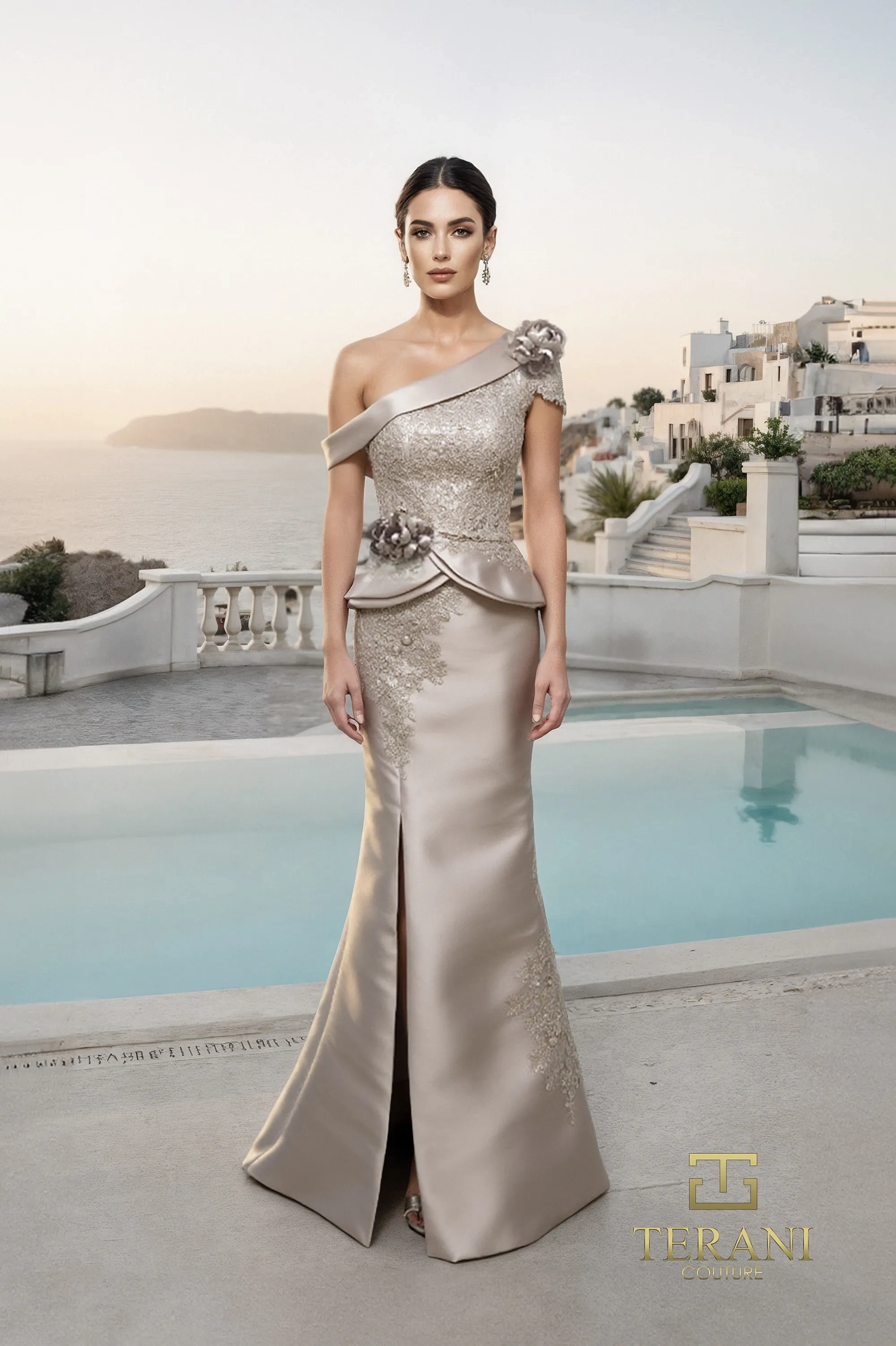 Elevate your formal wardrobe with 261M6408 Asymmetric Peplum Sheath Gown, a masterclass in refined sophistication. This long sheath design is crafted from luminous Mikado blended with delicate lace, creating a perfect balance of structure and femininity. Offered in elegant shades of mocha, navy, and wine, the gown showcases an asymmetric neckline that adds a modern edge, while the sculpted peplum accent at the waist defines and flatters the silhouette. The sleek sheath skirt extends 46" from the waist to hem, complemented by a graceful front slit for ease of movement and understated allure. A concealed center-back zipper with hook-and-eye closure ensures a flawless fit, while the sleeveless cut highlights the shoulders with confidence. Available in sizes 0–24, this gown is an ideal choice for mothers of the bride or groom who desire elegance with a contemporary twist.