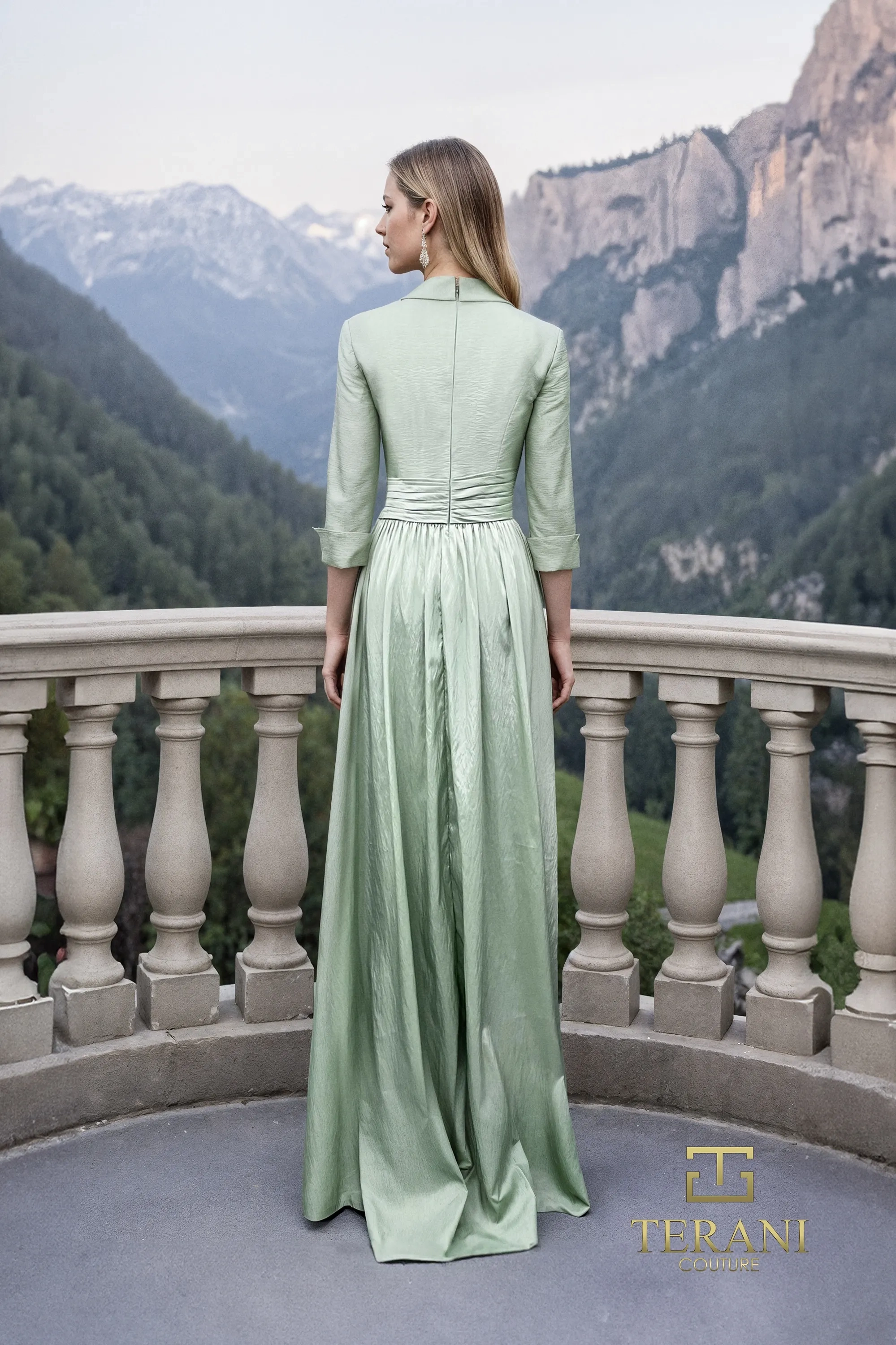 Grace your next special occasion in refined elegance with the Terani Couture 261M6418 gown. This sophisticated A-line design is crafted from matte taffeta, offering a subtle sheen and structured flow that moves effortlessly with every step. The collared neckline plunges into a deep V, creating a modern twist on a timeless silhouette, while 3/4 sleeves provide graceful coverage that flatters. A fitted waist transitions into a fluid skirt that falls 46 inches from waist to hem, ensuring both comfort and drama. Finished with a concealed center-back zipper and hook-and-eye closure, this gown is designed for a flawless fit. Available in pale green and light blue, it’s a chic choice for mothers of the bride, formal galas, or any event that calls for understated luxury.