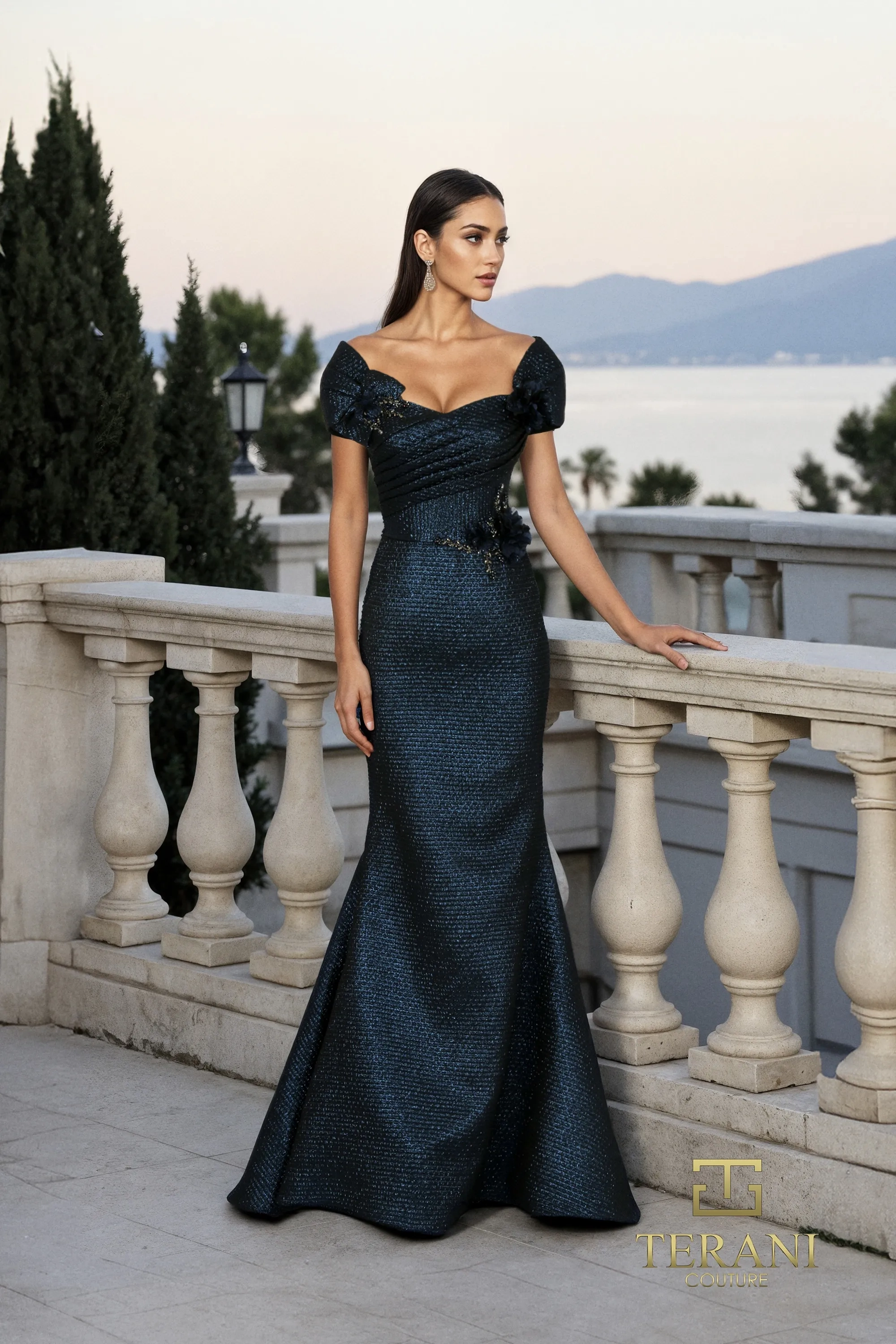 Exude timeless elegance in the 261M6449 Metallic Jacquard Mermaid Gown, a masterpiece designed for unforgettable moments. This mother-of-the-bride gown showcases a romantic sweetheart neckline paired with graceful cap sleeves that frame the shoulders with refined poise. The fitted bodice contours the figure before flowing into a dramatic mermaid skirt, enhancing natural curves while offering striking sophistication. Crafted in shimmering metallic jacquard, the fabric catches the light beautifully, ensuring a radiant presence at every angle. A secure zipper with hook-and-eye closure at the center back guarantees comfort and ease, while the 46” hem from waist to floor elongates the silhouette. Available in navy, amber, and rose gold, this gown delivers a perfect balance of glamour and grace. Whether for weddings, galas, or evening affairs, Terani Couture elevates your style with polished confidence.