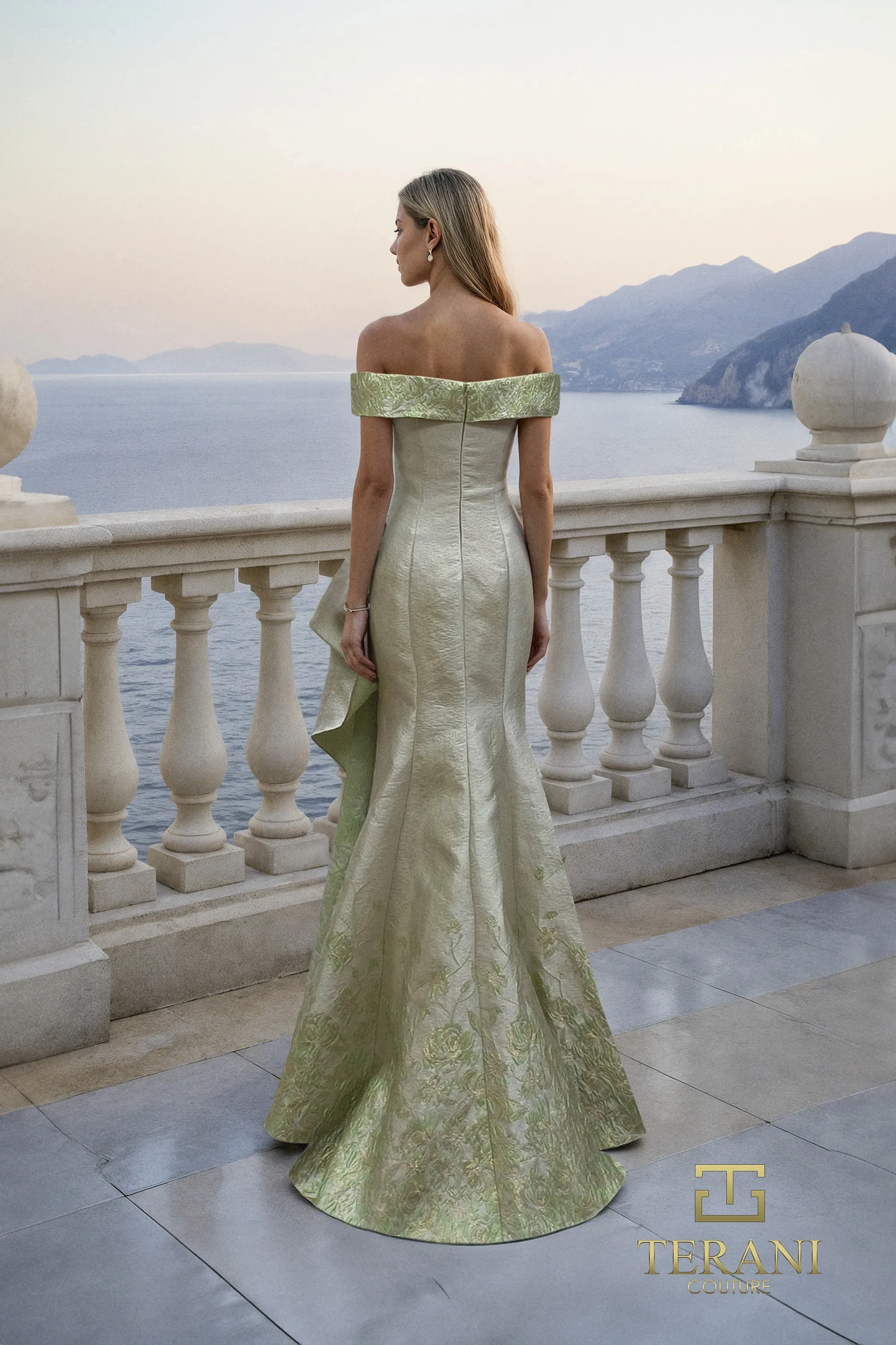 Radiate timeless elegance in the Terani Couture 261M6451 mother of the bride gown, a refined creation crafted from luxurious jacquard. This fitted column silhouette features an off-the-shoulder neckline that beautifully frames the décolletage, offering a classic yet modern appeal. The bodice flows seamlessly into a sleek floor-length skirt enhanced with artful draping that highlights the waistline and adds soft dimension. With its clean lines and structured tailoring, this gown elongates the figure, creating a statuesque look perfect for formal celebrations. Designed with a center back zipper and hook-and-eye closure, it provides both comfort and security throughout the evening. Measuring 46 inches from waist to hem, this sophisticated style is offered in Silver Light Green and Silver Fuchsia—two radiant options that ensure you stand out with grace and poise.