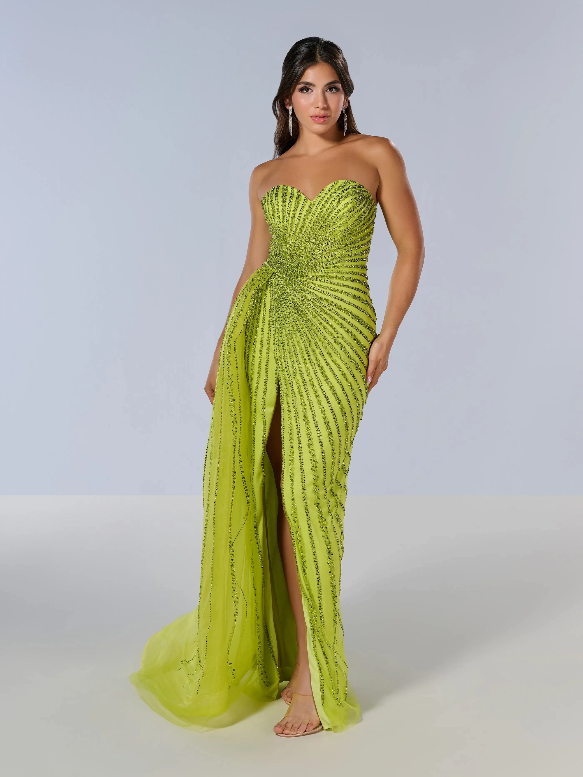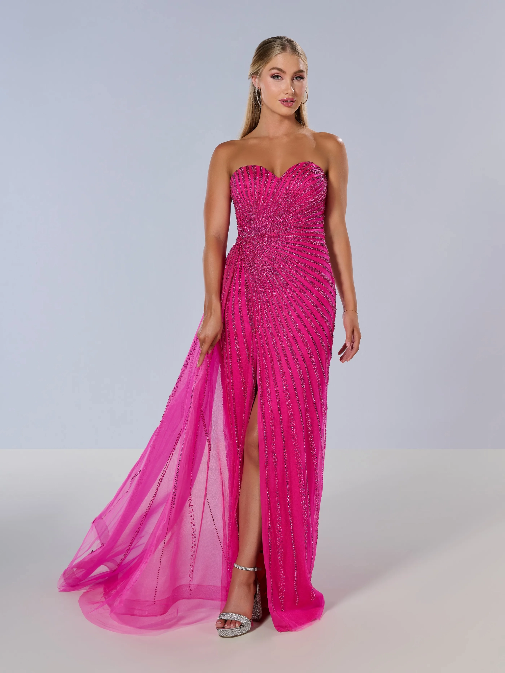 This stunning gown features delicate beaded tulle crafted into a slim-fit overskirt, complemented by a timeless sweetheart strapless top that epitomizes grace and allure.