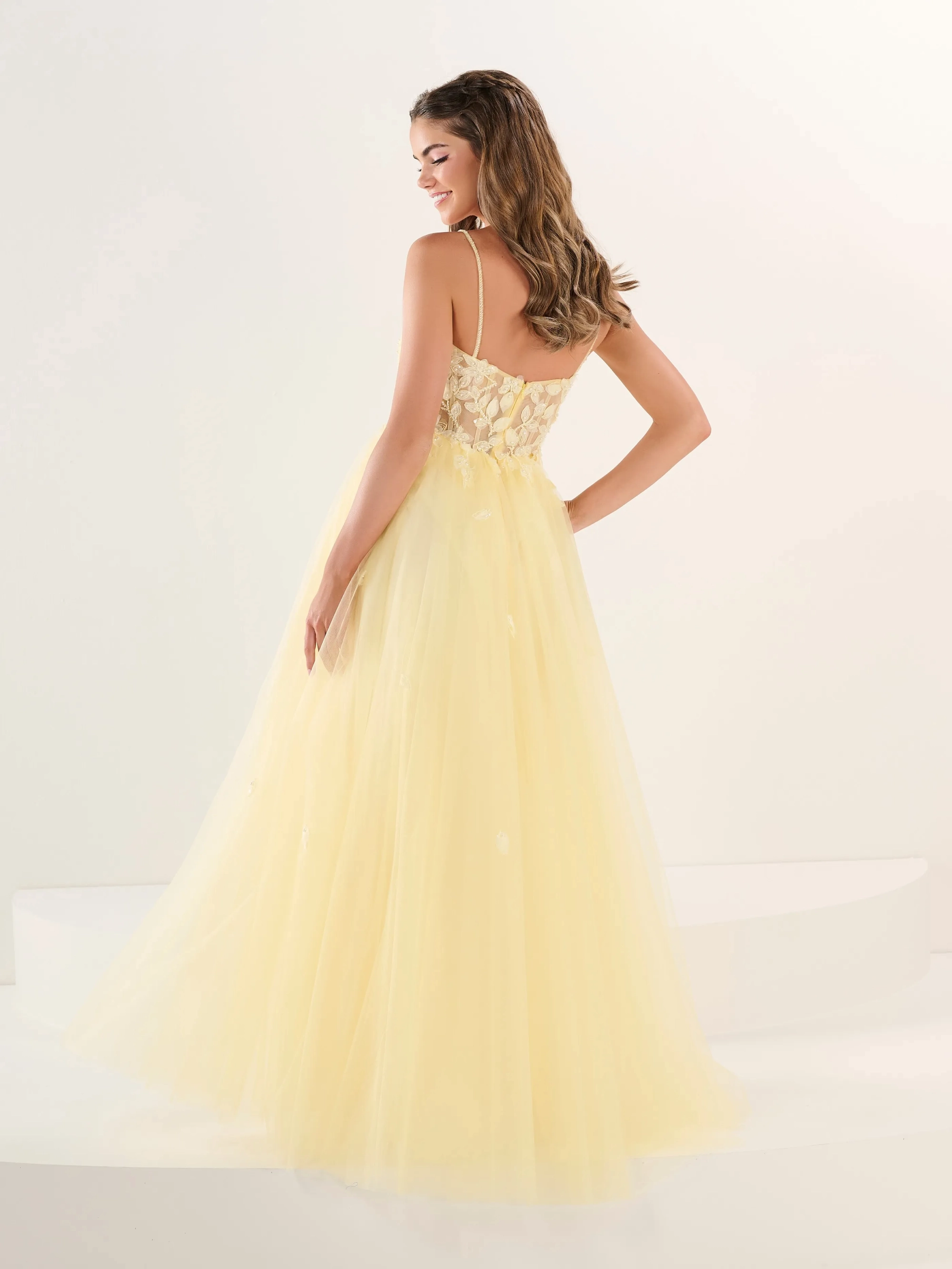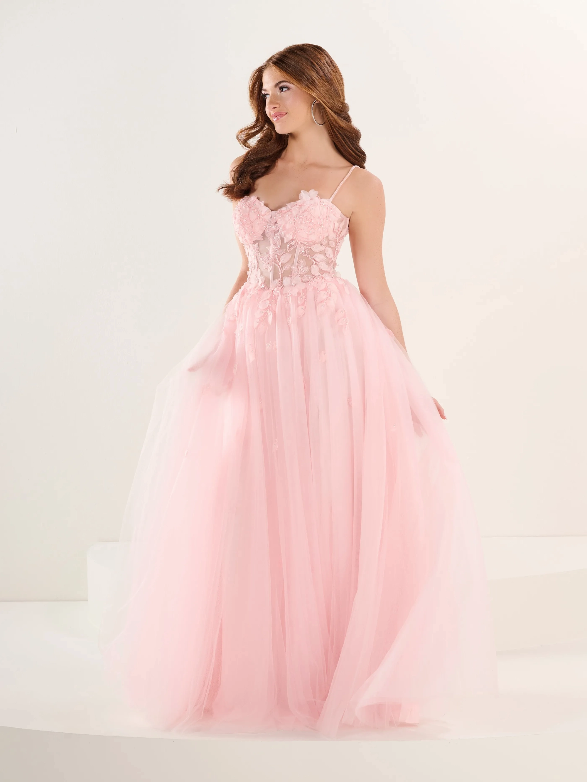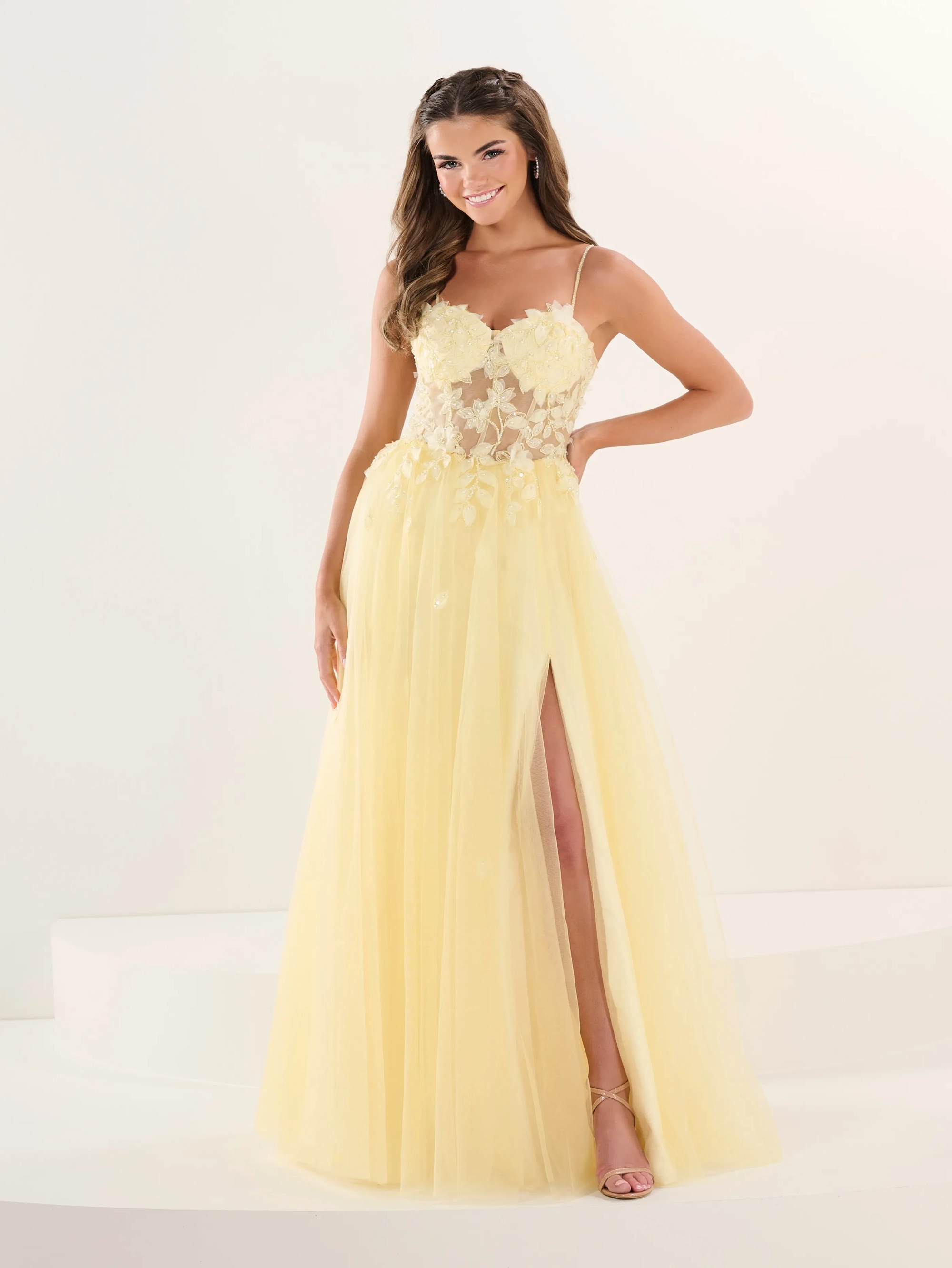 Strapless sweetheart A-line with floral with 3D organza floral applique.