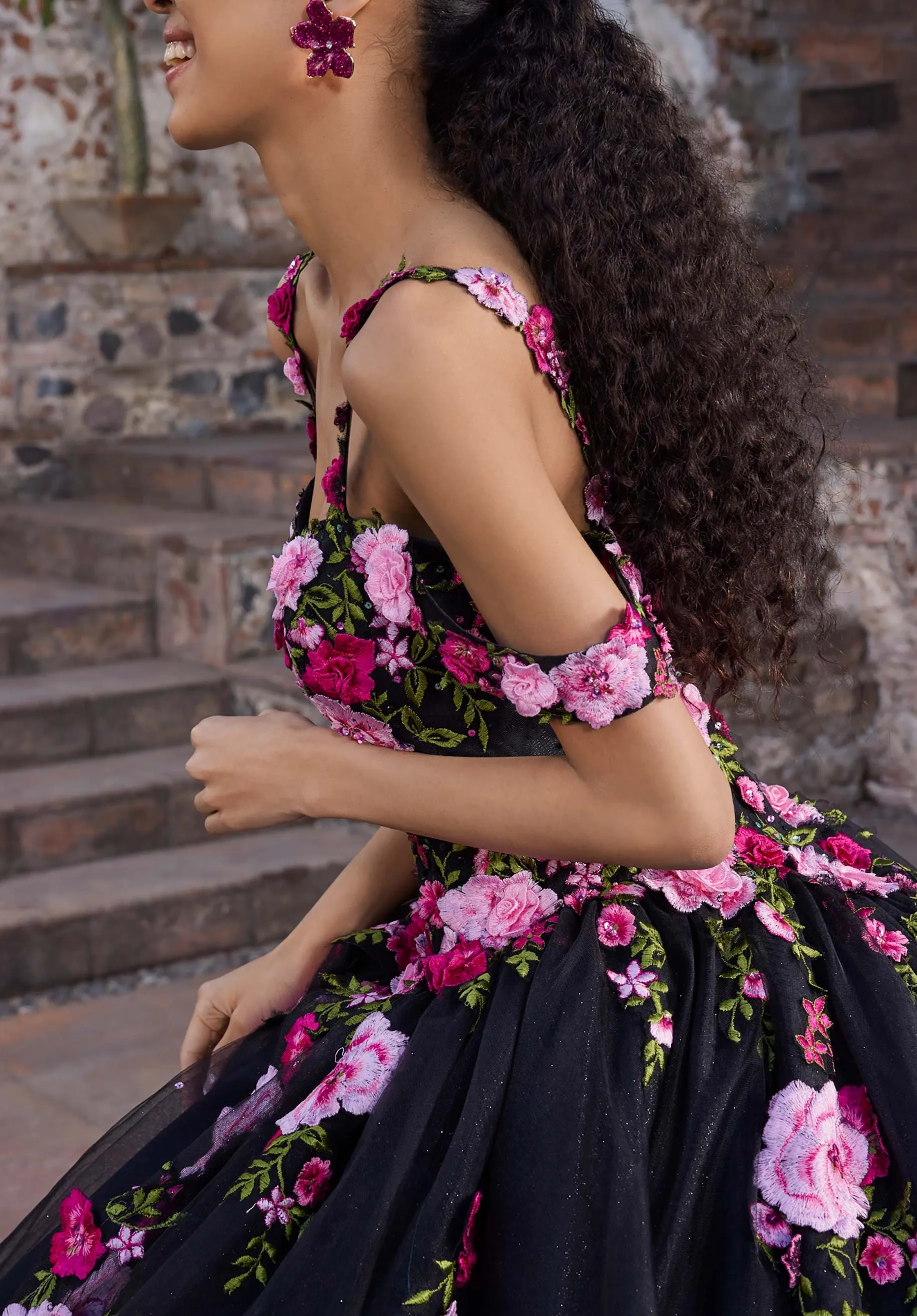 Our Austyn Quinceañera dress is an exquisite tulle gown, designed to make your day truly unforgettable. The sweetheart neckline is framed by delicate floral embroidered straps, leading to a structured corset back. A floral embroidered peplum hem adds a whimsical layer of texture and movement, enhancing the ethereal beauty of the skirt. Customize your look with detachable off-shoulder draped straps for soft elegance, a dramatic floral embroidered train that flows with every step, and a double-loop bow adorned with matching floral embroidery and trailing tails.