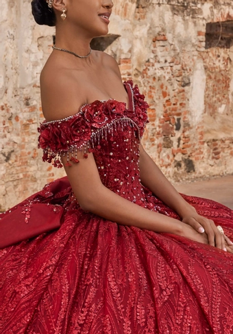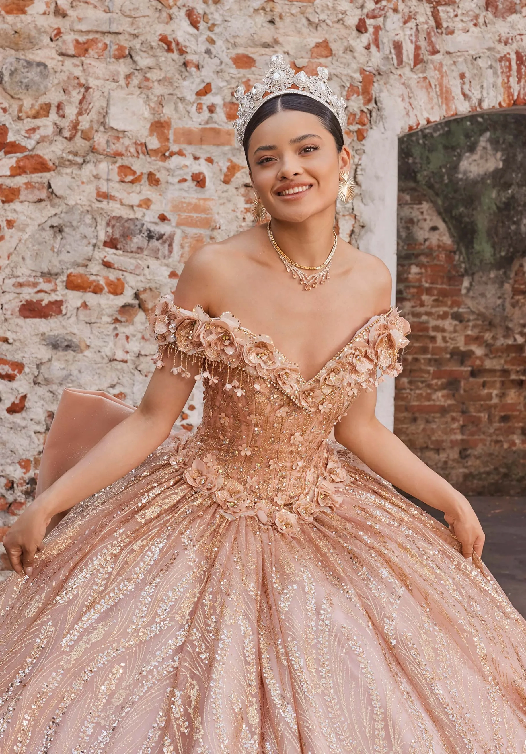 Elevate your quince look in our Amelia Quinceañera dress featuring a soft portrait neckline adorned with delicate floral appliqués that frame your face. The structured bodice is enhanced by boning and a lace-up corset back for a custom fit. A basque waist adds timeless sophistication, leading into a glitter tulle skirt embellished with subtle floral motifs that catch the light beautifully. Complete your ensemble with a detachable geometric motif appliqué bow, offering a modern twist to this romantic design.