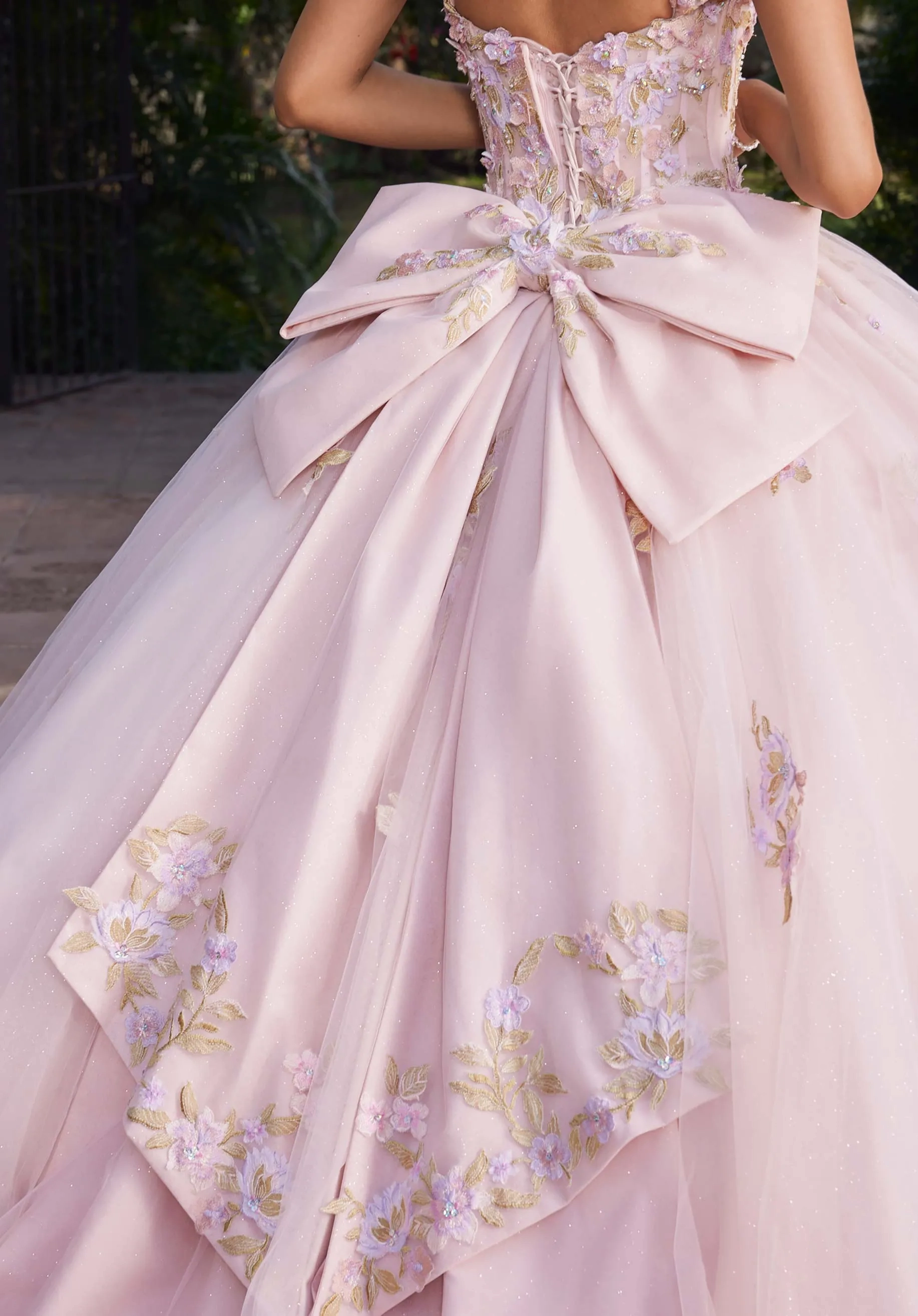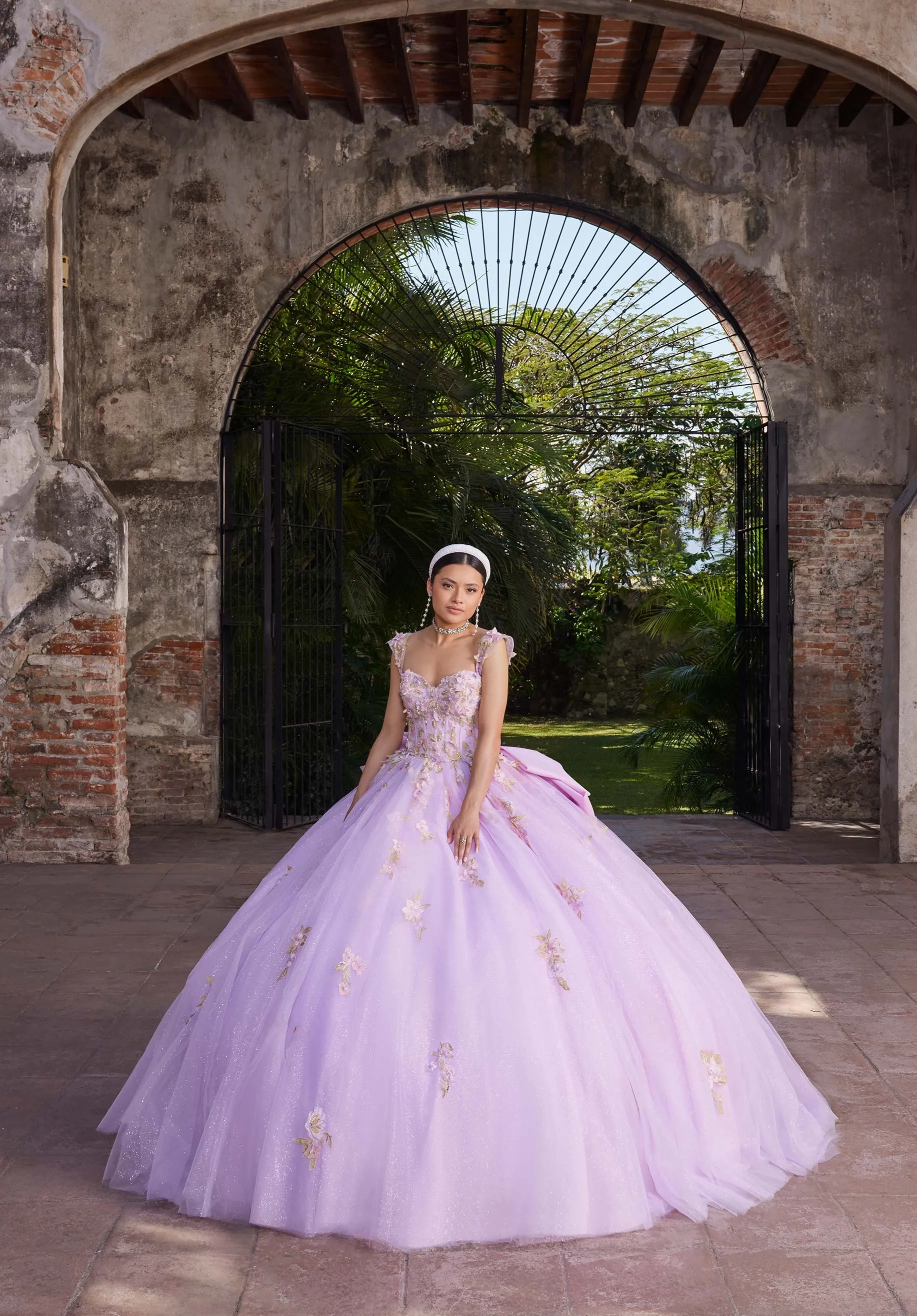 Our Aminita Quinceañera dress is designed to dazzle on your special day. The sweetheart neckline and boned bodice creates a sculpted silhouette, while the corset back adds structure and charm. Shimmering floral appliqués, accented with sequins and beading, bloom across the glitter tulle, adding sparkle and dimension from every angle. For added versatility, the gown features a detachable off-the-shoulder drape and a dramatic double-loop bow with flowing tails, intricately embellished to match the gown’s floral details.