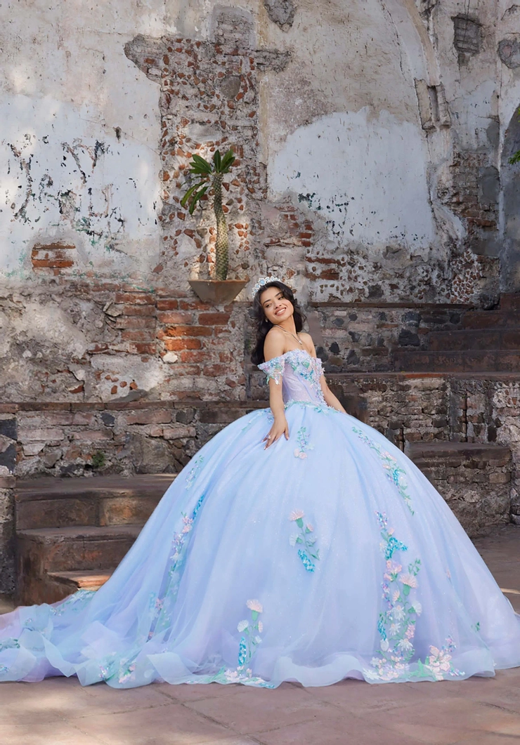 Celebrate your quinceañera in full bloom with our Anahi Quinceañera dress. The sweetheart neckline and boned bodice offer timeless structure, while the corset back adds a touch of classic charm. A garden of multicolor floral appliqués blossom along the hem of the glitter tulle skirt, adding vibrant dimension and fairytale beauty. Detachable off-the-shoulder sleeves give you the freedom to switch up your look, and a detachable bow completes the ensemble with a playful, elegant touch.